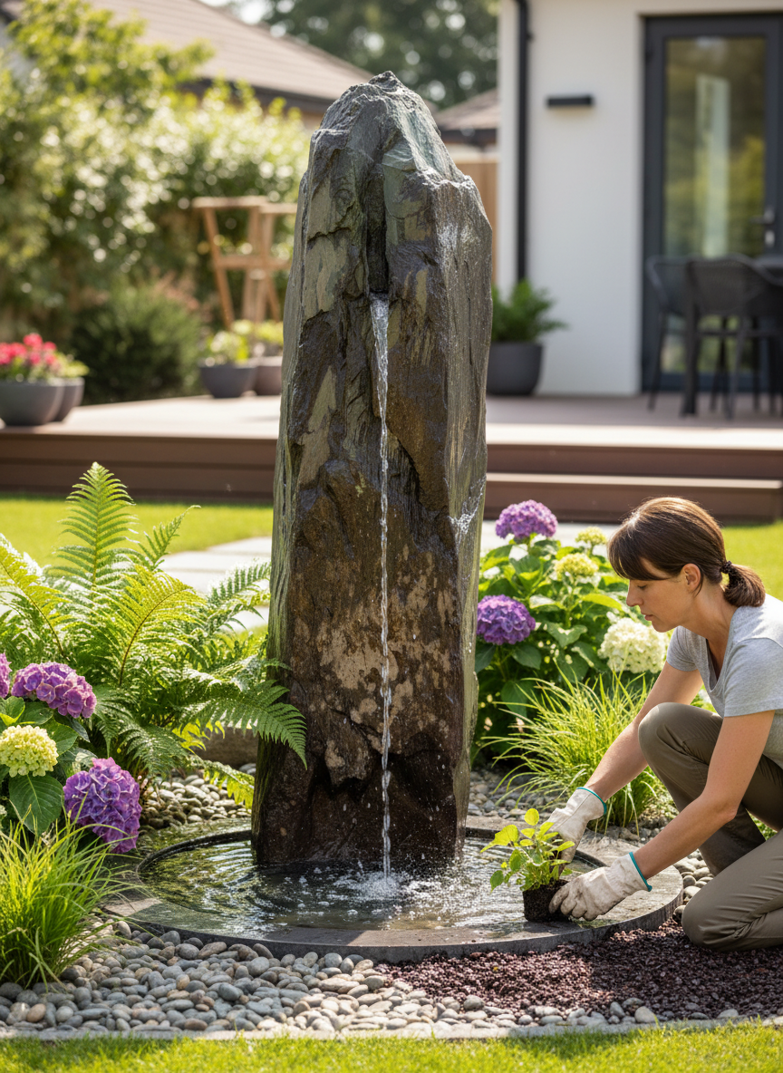 Due to the size and weight of this product, it is essential to arrange for mechanical lifting to position the monolith securely. A strong base or sump is recommended for larger slate monoliths to ensure stability.